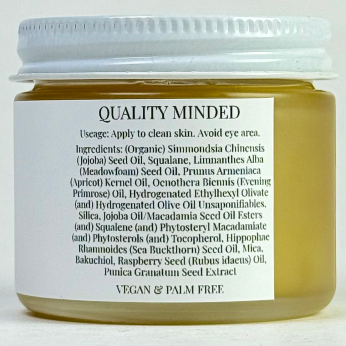Full Ingredients: (Organic) Simmondsia Chinensis (Jojoba) Seed Oil, Squalane, Limnanthes Alba (Meadowfoam) Seed Oil, Prunus Armeniaca (Apricot) Kernel Oil, Oenothera Biennis (Evening Primrose) Oil, Hydrogenated Ethylhexyl Olivate (and) Hydrogenated Olive Oil Unsaponifiables, Silica, Jojoba Oil/Macadamia Seed Oil Esters (and) Squalene (and) Phytosteryl Macadamiate (and) Phytosterols (and) Tocopherol, Hippophae Rhamnoides (Sea Buckthorn) Seed Oil, Mica, Bakuchiol, Raspberry Seed (Rubus idaeus) Oil, Punica Granatum Seed Extract